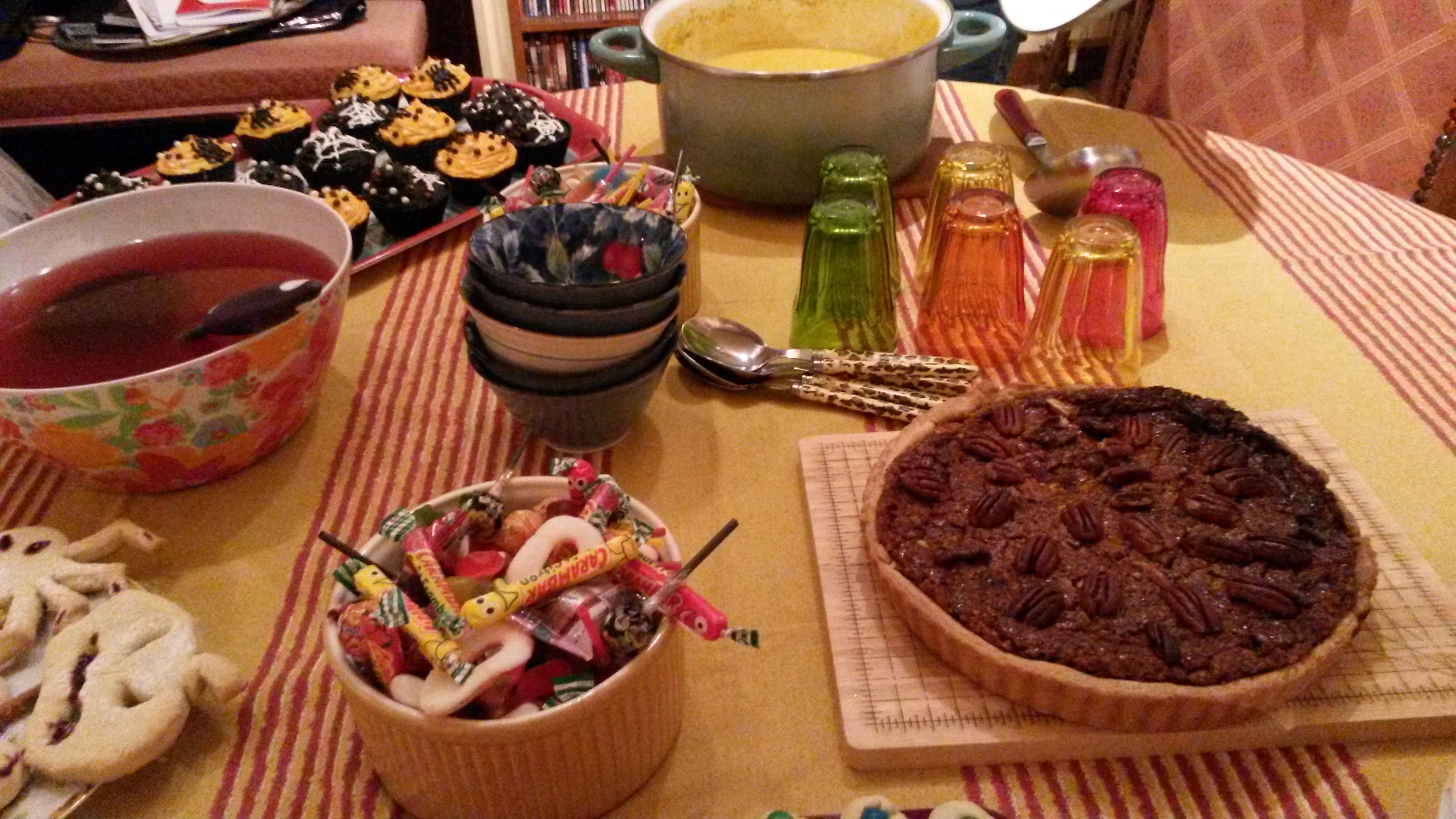 J’espère que vous avez tous passé une agréable fête d’Halloween. Ma famille et moi n’avons malheureusement pas pu célébrer la fête le soir du 31 octobre, mon travail ne me le permettant pas. Ce n’était bien entendu que partie remise puisque notre petite fiesta fut reportée le lendemain même. La soirée fut inoubliable !! Tout le monde (sauf moi qui travaillait encore une fois durant les préparatifs !) a mis la main à la pâte. Je suis rentrée tard pour trouver une maison silencieuse, plongée dans une obscurité totale. Ma sœur avait préparé une playlist angoissante… Toute la famille s’était déguisée pour l’occasion. Nous nous sommes goinfrés de cupcakes oranges et noirs, de tarte de noix de pécan accompagnée de glace vanille (cuisinée avec amour par mon tendre!!) et d’autres friandises irrésistibles. Il y avait également du punch concocté par ma sœur la Gueuse et sa copine. Enfin, nous avons choisi de visionner en famille un film soft, Les sorcières d’Eastwick (pas si soft que ça puisque le film s’est avéré finalement bien dérangeant). Bref, Halloween s’est tout de même terminé pour nous en beauté et nous nous sommes bien amusés !