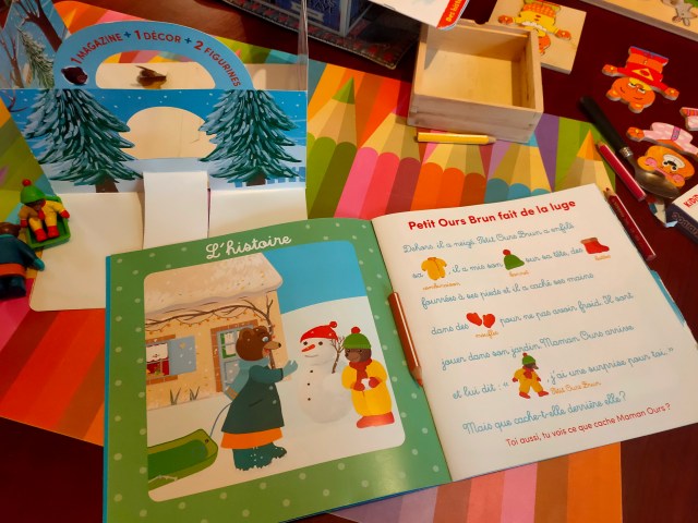 Nous avons aussi découvert le Hors-série de Petit ours brun qui paraît tous les mois. Ce magazine peut être abordé dès l’âge d’un an, il semblait donc tout à fait adapté à la Poupouche. J’ai beaucoup aimé le petit décor ainsi que les figurines qui complètent le numéro. La thématique de l’hiver est représentée avec des illustrations magnifiques et féériques. Des jeux permettent d’apprendre à l’enfant à repérer des objets ainsi que des personnages dans de jolis paysages. Nous allons le tester dans les semaines à venir. Pour le moment, la Poupouche a été davantage sensible aux figurines plutôt qu’au livret qui malheureusement l’a laissée assez de marbre. Pas grave, nous tenterons demain soir lorsqu’elle sera plus calme… Il a fallu d’ailleurs batailler pour maintenir le décor en un seul morceau, la tâche n’a pas été aisée !