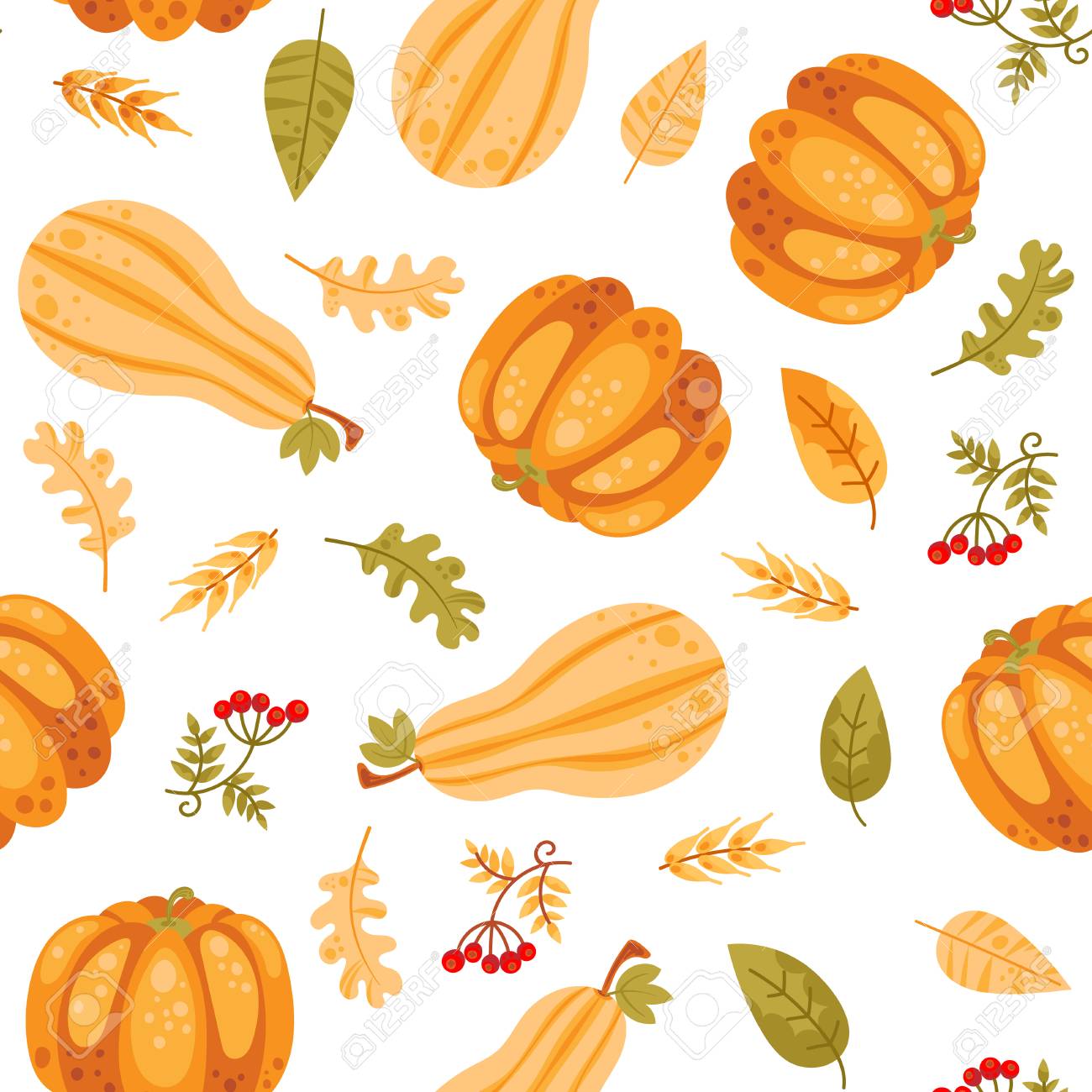 Seamless pattern with cartoon pumpkin and autumn leaves in bright color.Thanksgiving day vector background.